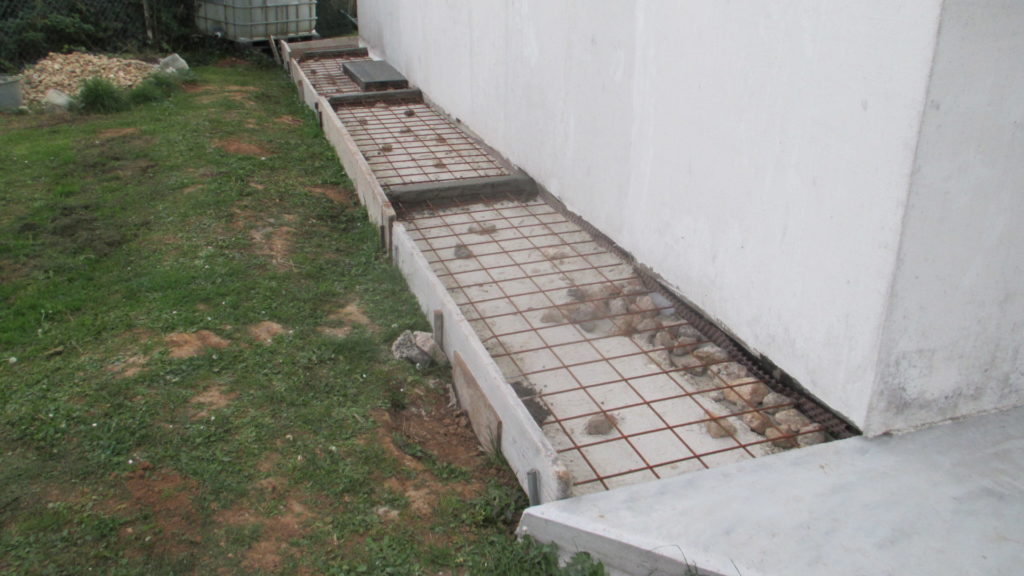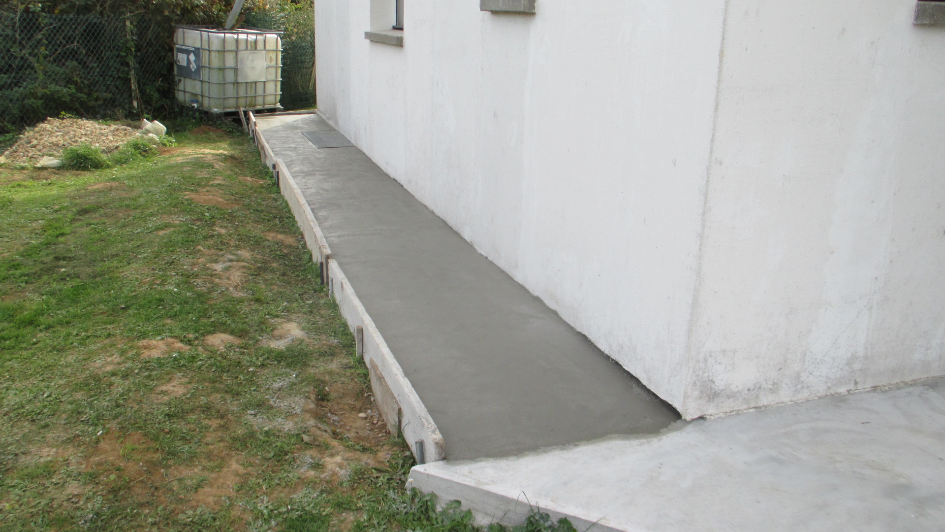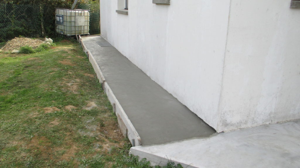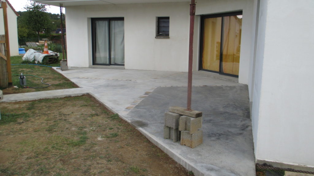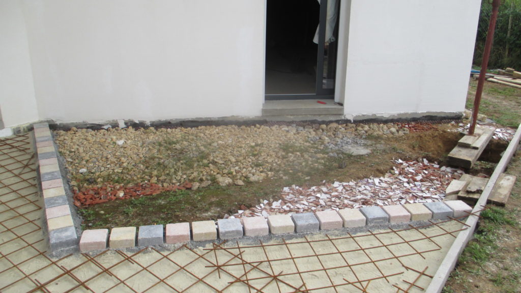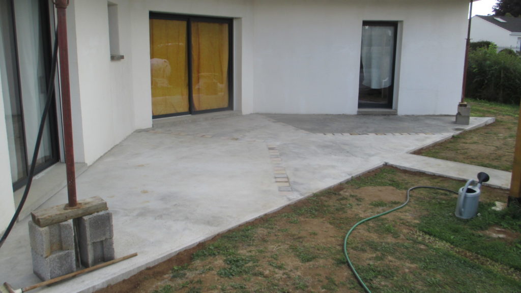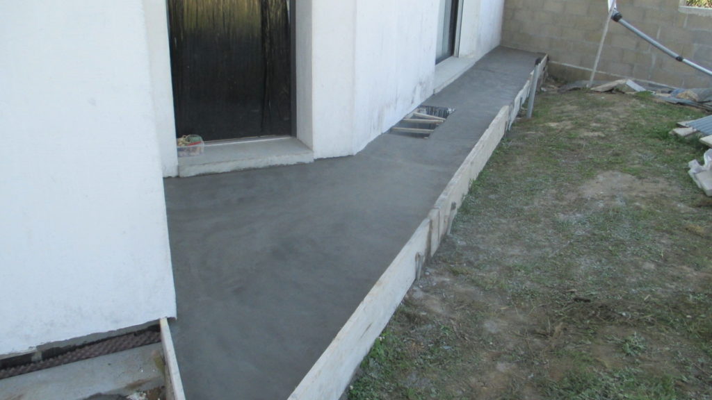 Pour que l’enduit ai un appui en partie basse du mur, et pour éviter se salir ou devoir protéger l’enduit, je décide de faire la terrasse coté sud et le dallage coté est ( 0.9 m de large) avant les enduiseurs.