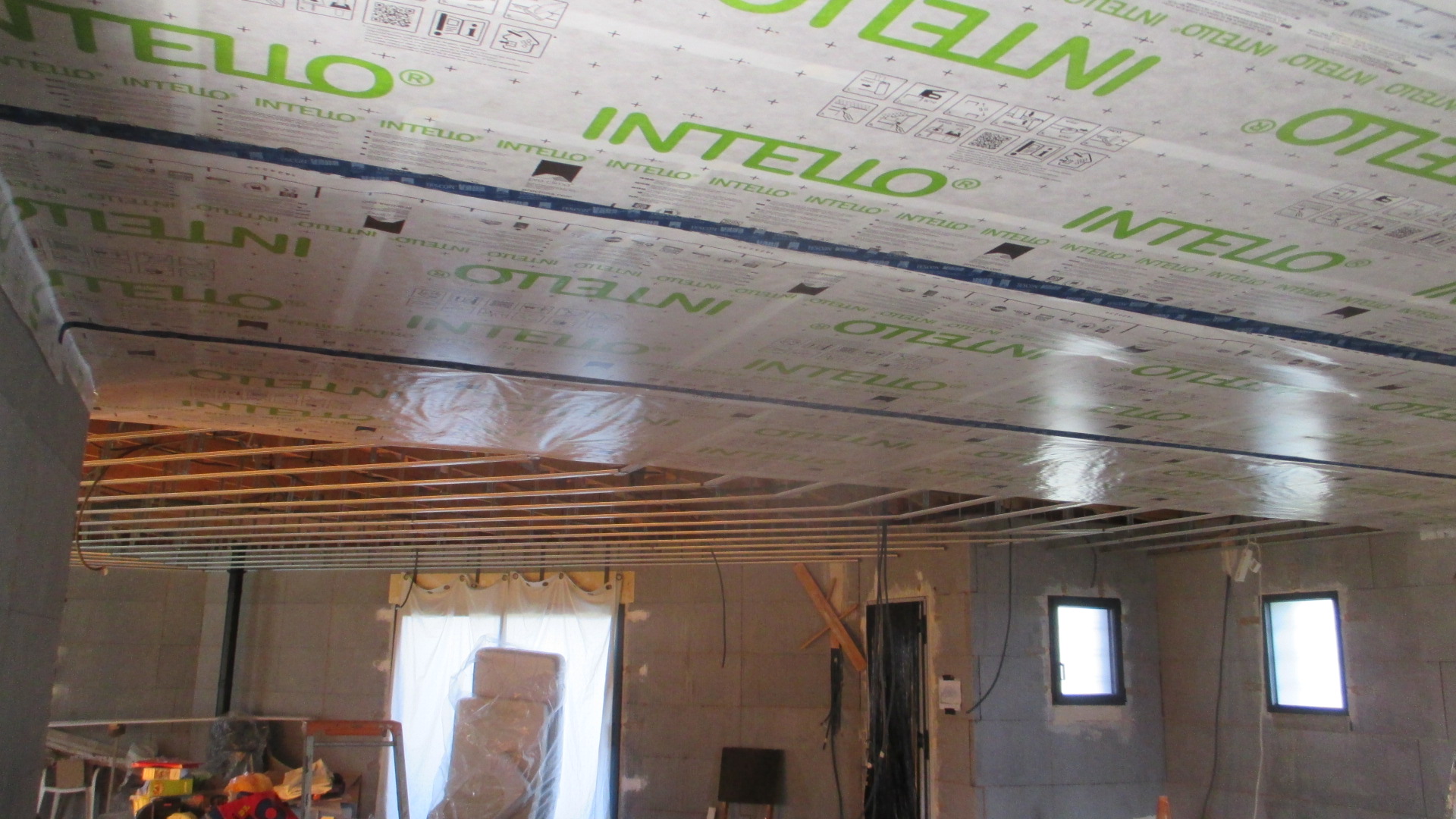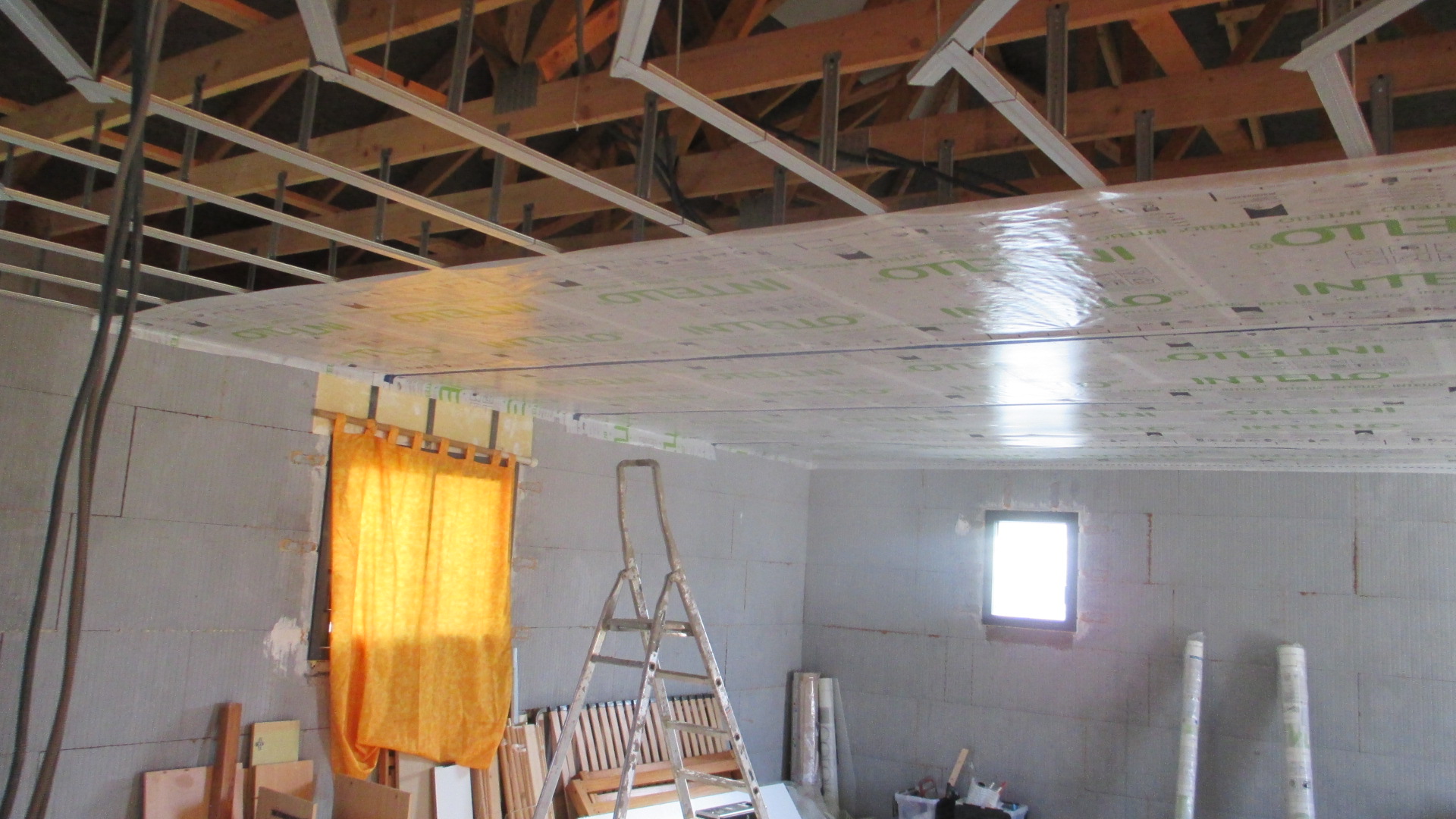 Et on enchaîne avec le frein-vapeur Proclima, double face pour le maintenir sur les fourrures, mastic au mur et scotch de liaison (bleu) des bandes de 1.5 m :
